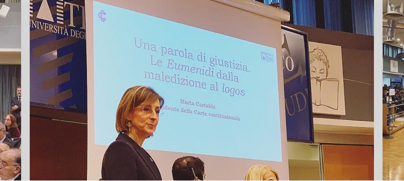 E' davvero un onore e una gioia grande partecipare allinaugurazione dellanno accademico di un ateneo a me caro, per la presenza di tanti colleghi con cui ho condiviso importanti attività scientifiche, didattiche e culturali in senso lato, per lapertura e il dinamismo che lo contraddistingue, per il senso di comunità che si respira in ogni iniziativa, per laffabilità di tutte le persone che lo abitano, a partire dal tratto umano inconfondibile di chi ricopre la massima responsabilità. Mi si consenta di premettere qualche parola sulla scelta del tema. Eumenidi: una tragedia di Eschilo del V secolo a.C. incentrata sul problema della giustizia. Perché ritornare a un testo così remoto? Perché, soprattutto, da parte di chi non è unesperta di cultura, lingua e civiltà della Grecia antica, ma si occupa di giustizia del nostro tempo? Invero, non è la prima volta che mi occupo di questi temi e se mi accingo a prendere nuovamente la parola a partire da una tragedia classica è per la convinzione che i testi a cui oggi ci accostiamo ci conducono in un mondo senza tempo che parla a ogni tempo, sanno raggiungere ogni uomo e a ogni donna, in qualunque condizione e in qualunque epoca, per quella energia di reiterazione di cui parlava Steiner che la tragedia porta con sé, cioè la loro inesauribile capacità di inventare storie (E. Cantarella). Storie che sono attuali, non da attualizzare: perché narrano i problemi della polis collocandoli in un contesto mitico, che conferisce alla narrazione quella distanza tragica che la spoglia di ogni contingenza e la focalizza sulle dinamiche proprie di ogni relazione umana e sociale di sempre. La chiave di ingresso ci è offerta dalle parole di Marc Bloch: «È necessario che nella natura umana e nelle umane società ci sia un sostrato immutabile», che legittima anche noi, donne e uomini del XXI secolo, a «porre agli antichi le domande che appaiono più pertinenti a noi moderni». Fiduciosa di questa potenza della tragedia, più che della solidità delle mie riflessioni, mi accingo a porgere a questo illustrissimo uditorio alcune suggestioni che la rilettura dellOrestea di Eschilo e, in particolare, delle Eumenidi offre a una giurista, che pratica le vie del diritto come studiosa nelle sue declinazioni costituzionali e come componente di quella Corte che sono onorata di presiedere. 1 Un passaggio di civiltà Eumenidi è la tragedia in cui, al termine della saga sanguinosa degli Atridi, un processo per matricidio pone fine alla violenza attraverso listituzione del tribunale, Come osserva Giorgio Agamben sulla scia di Nicole Loraux, lOrestea costituisce «levocazione della lunga catena di uccisioni nella casa degli Atridi e, insieme, la commemorazione del suo superamento attraverso la fondazione del tribunale dellAreopago, che porrà fine alla carneficina famigliare». In questo, ben si può dire che lOrestea celebri una svolta di civiltà. Eumenidi è la tragedia conclusiva dellunica trilogia che ci è pervenuta, è preceduta da Agamennone e dalle Coefore e vi si narra una storia di male che colpisce Ifigenia, Agamennone, Clitemestra, Oreste ed è provocata dallantica giustizia delle Erinni, antiche dee ctonie, mostruose figure femminili, legate al mondo sotterraneo e oscuro della notte, che scatenano la loro ira implacabile non appena si commette un delitto, soprattutto se è versato il sangue dei parenti. Se le prime due tragedie dellOrestea di Eschilo sono cupe e intrise di violenza, nella terza tragedia, le Eumenidi, il registro cambia. La vendetta si interrompe grazie allintervento di Atena dea della sapienza, scaturita dalla testa di Zeus la quale, per giudicare il caso di Oreste, istituisce un apposito tribunale, che ricorda la struttura dellAreopago, composto da dodici cittadini e presieduto dalla stessa Atena. Davanti a quel tribunale si celebra un processo: già in apertura, limputato riconosce di aver commesso il matricidio di cui è accusato; ma alla fine, nel momento della decisione, i voti sono pari, e si procede con lassoluzione di Oreste, perché Atena che presiede si schiera a suo favore e il suo voto pesa di più di quello degli altri membri. Nelle Eumenidi, la tragedia non finisce in tragedia. Oreste è prosciolto e lantica giustizia vendicativa delle Erinni subisce una profonda trasformazione. La dea Atena interviene non per elargire un atto di grazia verso limputato, ma per porre un nuovo ordine, che si affida anzitutto alla parola, al logos. La composizione e la rappresentazione dellOrestea si situano al culmine di un periodo di trasformazioni sociali e di riforme istituzionali che, dallepoca di Clistene a quella di Efialte, riguardano lintera struttura della città e interessano direttamente il ruolo dellAreopago, che si pone al centro delle nostre riflessioni. Con la riforma di Efialte del 462 si è «privato lAreopago della sua funzione di consiglio, di guardiano delle leggi per limitarlo ai suoi attributi giudiziari. Eschilo non sembra schierarsi né a sostegno né contro le riforme in atto. Al centro delle sue riflessioni si colloca la preoccupazione di scongiurare la stasis, la divisione e la lotta tra fazioni nella città e offrire un contributo alla costruzione di una comunità unita proiettata verso un futuro florido. Mio intendimento è sviluppare due ordini di considerazioni sollecitate dalla grande trasformazione di civiltà che si celebra nelle Eumenidi: Il primo riguarda le modalità di manifestazione della giustizia: dalla maledizione al logos. Il secondo attiene alle implicazioni della singola vicenda giudiziaria sulla intera polis. 2 Dalla maledizione al logos Nel passaggio dalla antica giustizia vendicativa al nuovo ordine fondato come dirà Atena «su un istituto di giustizia che resterà saldo per sempre», cioè il processo davanti a un tribunale, Atena non prende semplicemente il posto delle Erinni. Anzi: dopo aver udito la confessione di Oreste, ella si astiene dal giudicare da sola, per la complessità dell