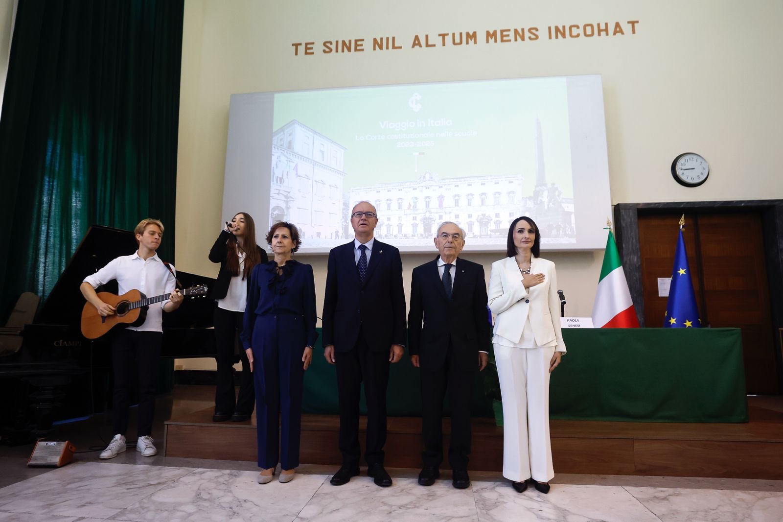 È ripartito, con la nuova edizione 2025-2027, il “Viaggio in Italia” dei giudici costituzionali nelle scuole secondarie di II grado. Il 2 ottobre, nell’aula magna del Liceo classico statale Giulio Cesare di Roma, alla presenza del Ministro dell’istruzione e del merito Giuseppe Valditara, il Presidente della Corte costituzionale Giovanni Amoroso ha incontrato le studentesse e gli studenti, dialogando con loro sul tema “Come nasce la Costituzione”. All’evento inaugurale hanno preso parte anche i giudici Stefano Petitti, Angelo Buscema, Maria Rosaria San Giorgio, Marco D’Alberti e Massimo Luciani.
